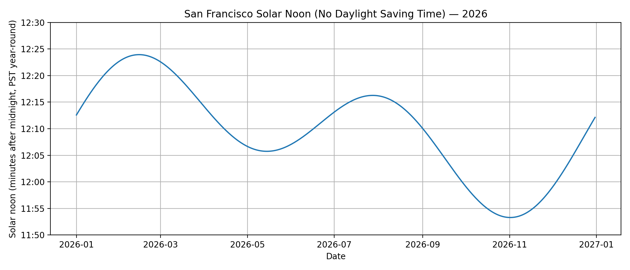 High noon in San Francisco occurs at about 12:08 PM during Standard Time (early November to mid-March) and about 1:08 PM during Daylight Saving Time (mid-March to early November). However, it varies every day. Here's a graph of the actual time, but neglecting Daylight Saving Time. Therefore, one needs to add an hour to the time during Daylight Saving Time.